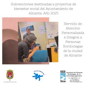 Gracias a la Concejalía de Bienestar Social del Ayuntamiento de Alicante a través de las Subvenciones destinadas a proyectos de bienestar social del Ayuntamiento de Alicante. Año 2025 por la concesión de 9.051,06€ para el programa Servicio de Atención Personalizada e Integral a Personas Sordociegas de la ciudad de Alicante.