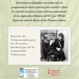 Gracias a la Vicepresidencia y Conselleria de Servicios Sociales, Igualdad y Vivienda por la concesión a nuestra entidad de la subvención dirigida a la realización de programas de interés general para atender a fines de carácter social con cargo al tramo autonómico de la asignación tributaria del 0,7 por 100 del Impuesto sobre la Renta de las Personas Físicas 2025, para el programa de Servicio de Voluntariado para las personas Sordociegas de la Comunidad Valenciana (continuidad).