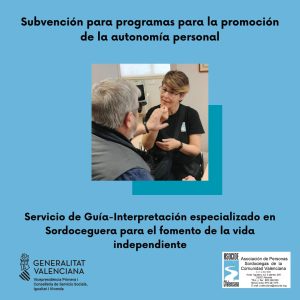 Gracias a la Vicepresidencia Primera y Conselleria de Servicios Sociales, Igualdad y Vivienda por la concesión de 5.974,90€ para el programa Servicio de Guía-Interpretación especializado en Sordoceguera para el fomento de la vida independiente en la subvención para programas para la promoción de la autonomía personal.